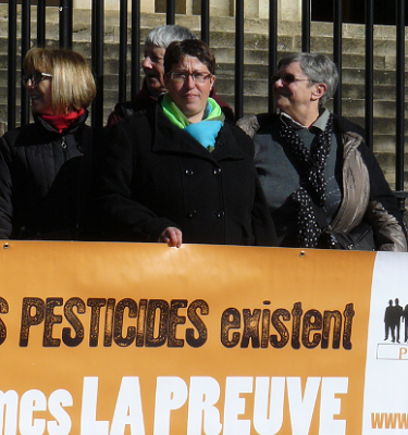 [Photo : Marie Lys Bibeyran lors du rassemblement de l’association PhytoVictime (derrière la banderole « Les malades des pesticides existent, nous en sommes la preuve »), devant la Cour d’Appel de Bordeaux, ce 5 mars]