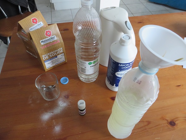Finalement, le plus pertinent me semble de réduire le nombre des produits ménagers utilisés dans la maison et de me tourner vers quelques produits de base qui ne sont pas dangereux pour la santé ni pour l’environnement : le vinaigre blanc, le bicarbonate et les cristaux de soude, le savon noir et le savon de Marseille. Total : 20 euros. En bonne apprentie chimiste, me voilà en train de faire le mélange pour fabriquer un nettoyant multi-usage qui s’avère efficace.