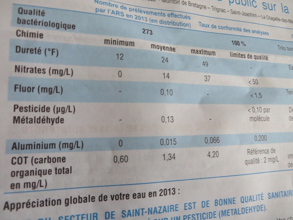 Avec ça, je croyais être allée au bout de la lutte contre les pesticides au quotidien. C’était sans compter sur l’eau du robinet. J’ai ressorti un courrier de mon fournisseur d’eau concernant la qualité sur son réseau. Et là, stupeur : des pesticides ! Leur quantité a même dépassé durant dix jours la limite autorisée par la loi.