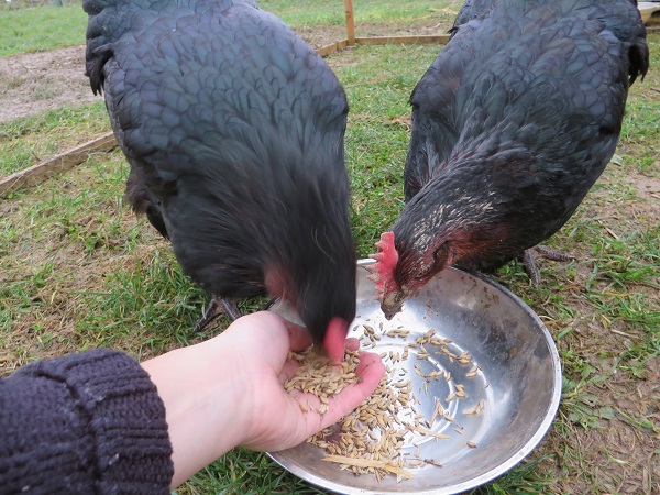 - Les poules sont nourries au grain bio, récupéré chez un généreux copain.