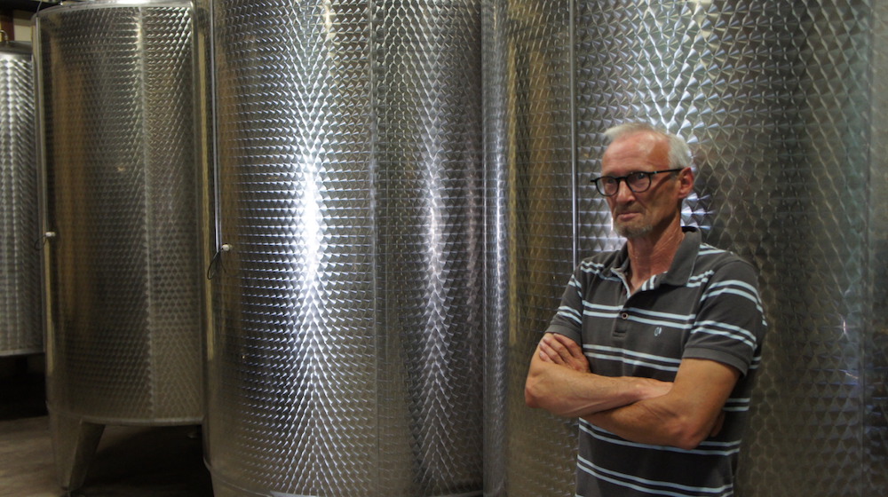 Jean-Michel Aubinel, président de la CAVB, photographié devant une de ses cuves. ©LB/Rue89Lyon