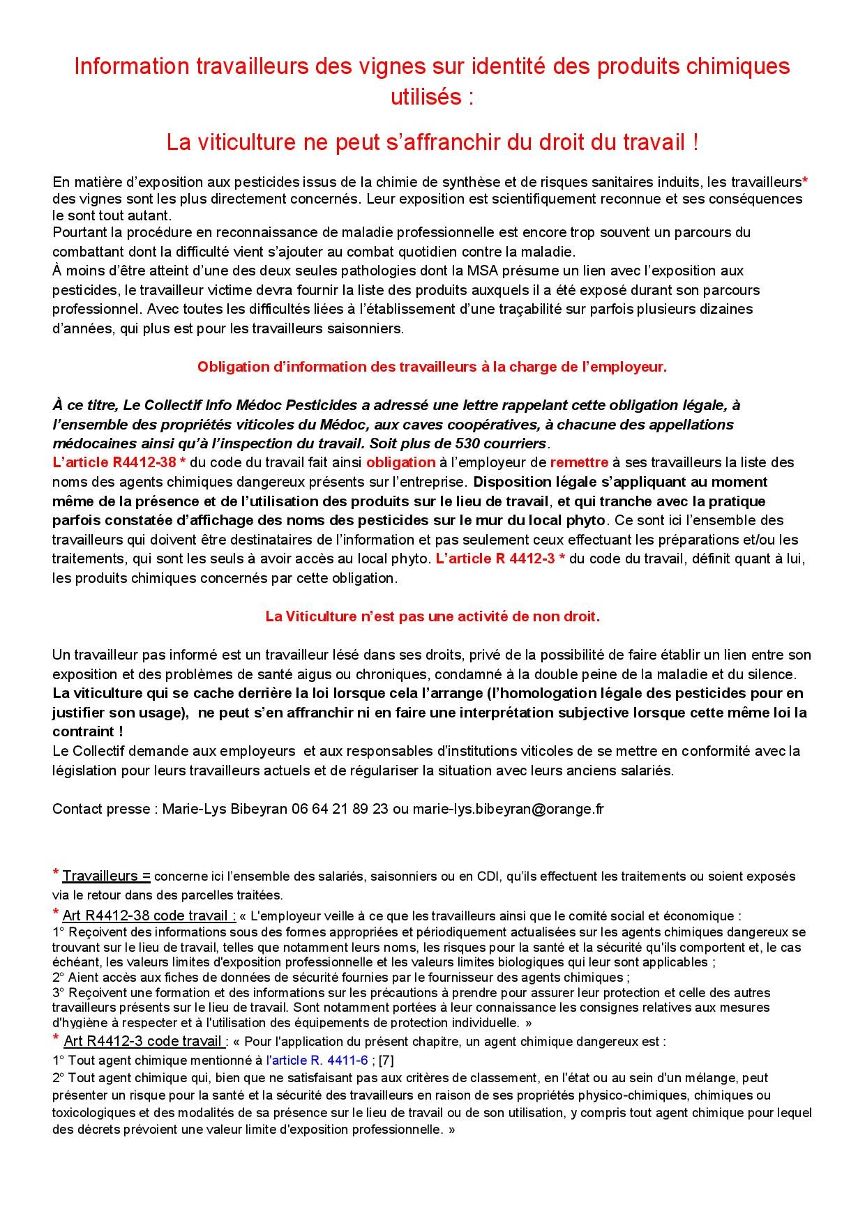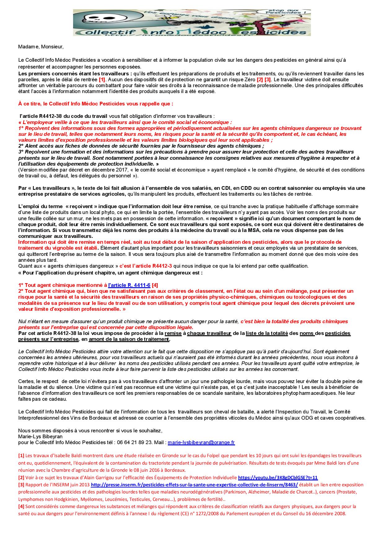 Le Collectif Info Médoc Pesticides, fait de l’application de ces dispositions législatives, son cheval de bataille. Un travailleur pas informé est une victime potentielle des pesticides, amputée de son droit à la reconnaissance de maladie professionnelle. en l’absence de la liste des noms des pesticides auxquels il a été exposé, soit il n’entamera pas la procédure, soit celle-ci n’aboutira pas.