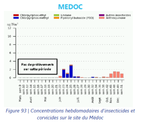 Il y avait alors eu 2 phases de mesures, l’une au printemps (aucune molécule détectée sur St Estèphe) et l’autre en été (3 molécules quantifiées : Folpel / Kresoxim méthyl / Chlorpyrifos méthyl).